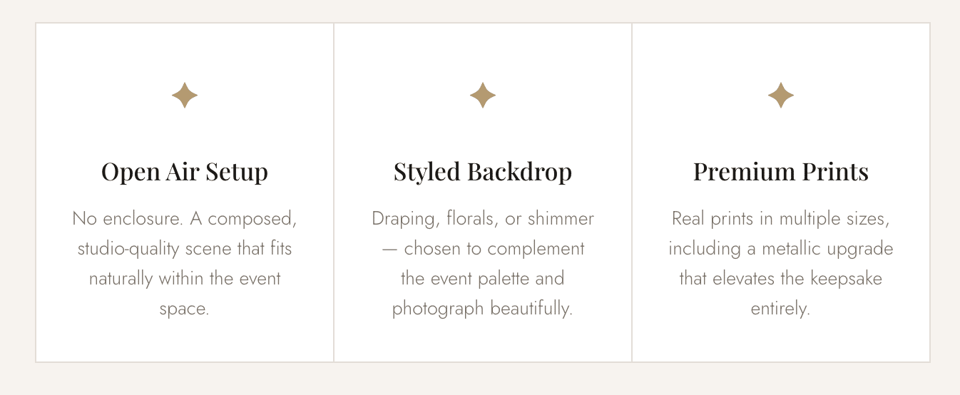 - It works for intimate events too.Not every event needs a full activation lineup. For smaller weddings, rehearsal dinners, or milestone celebrations, the portrait studio experience as a standalone is often exactly the right scale — one beautiful thing, done exceptionally well.
