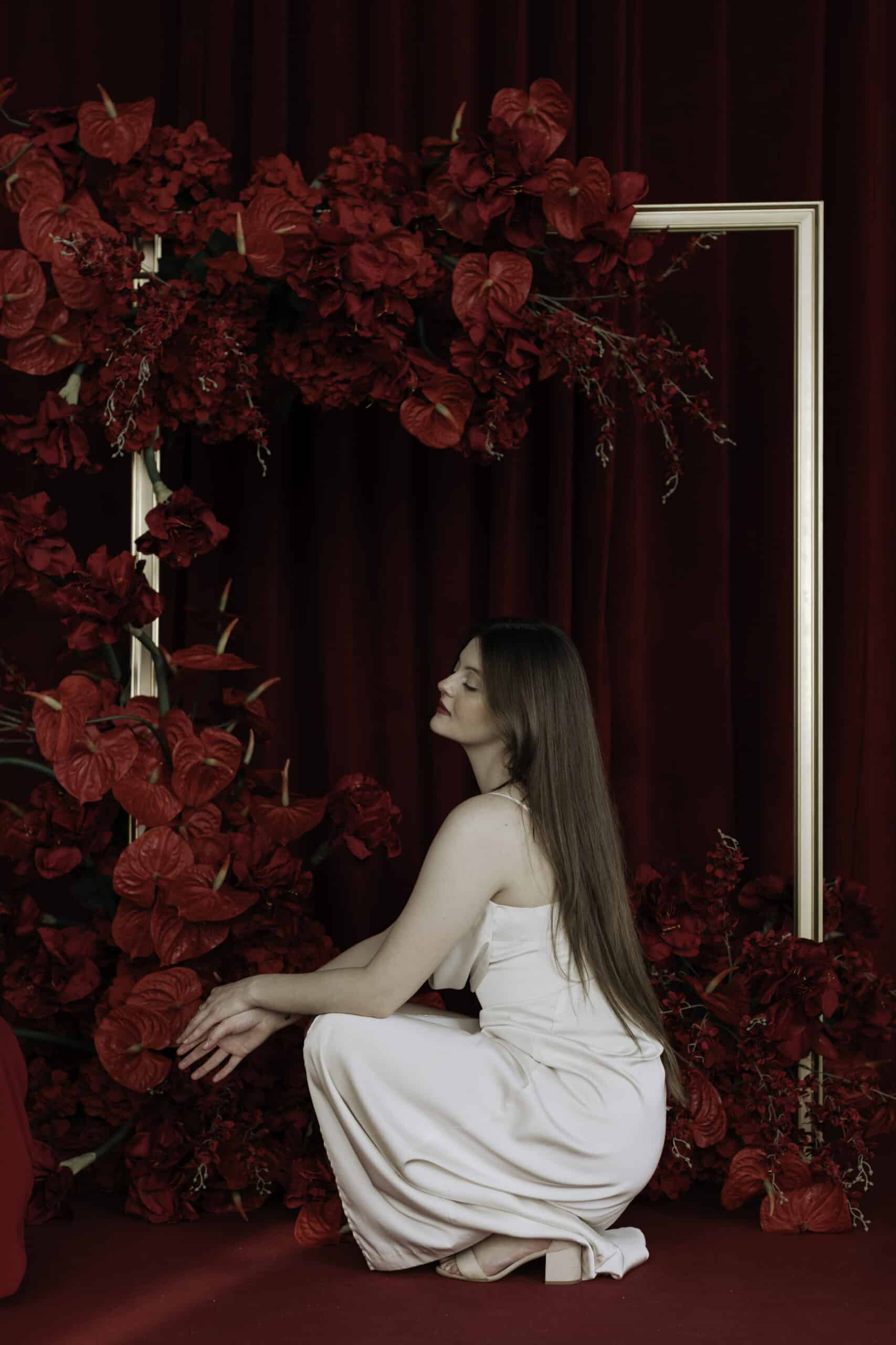 The scene is styled to complement the event’s aesthetic, not compete with it. A draped backdrop in merlot or mocha reads as elegant and timeless. Florals alongside ivory or terracotta draping feel warm and personal. A shimmer panel against a dark or jewel-toned event palette adds a quiet drama that translates beautifully in print. Every styling decision we make is driven by one question: what is going to look best in the photo?