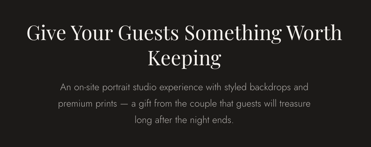 The portrait studio experience is a gift from the couple to their guests. A real, composed portrait — printed on-site and taken home that night — of a guest with the people who matter most to them, on a day they will never forget. It is not a novelty. It is not entertainment. It is a keepsake that will sit on a desk, hang on a wall, or get tucked into a frame that has been waiting for exactly this photo.