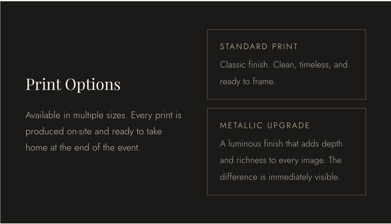 - The metallic print is the upgrade worth recommending.Standard prints are beautiful. Metallic prints are the ones guests photograph and post. For couples investing in a luxury experience, the metallic finish is worth it — and most guests who see one want one.