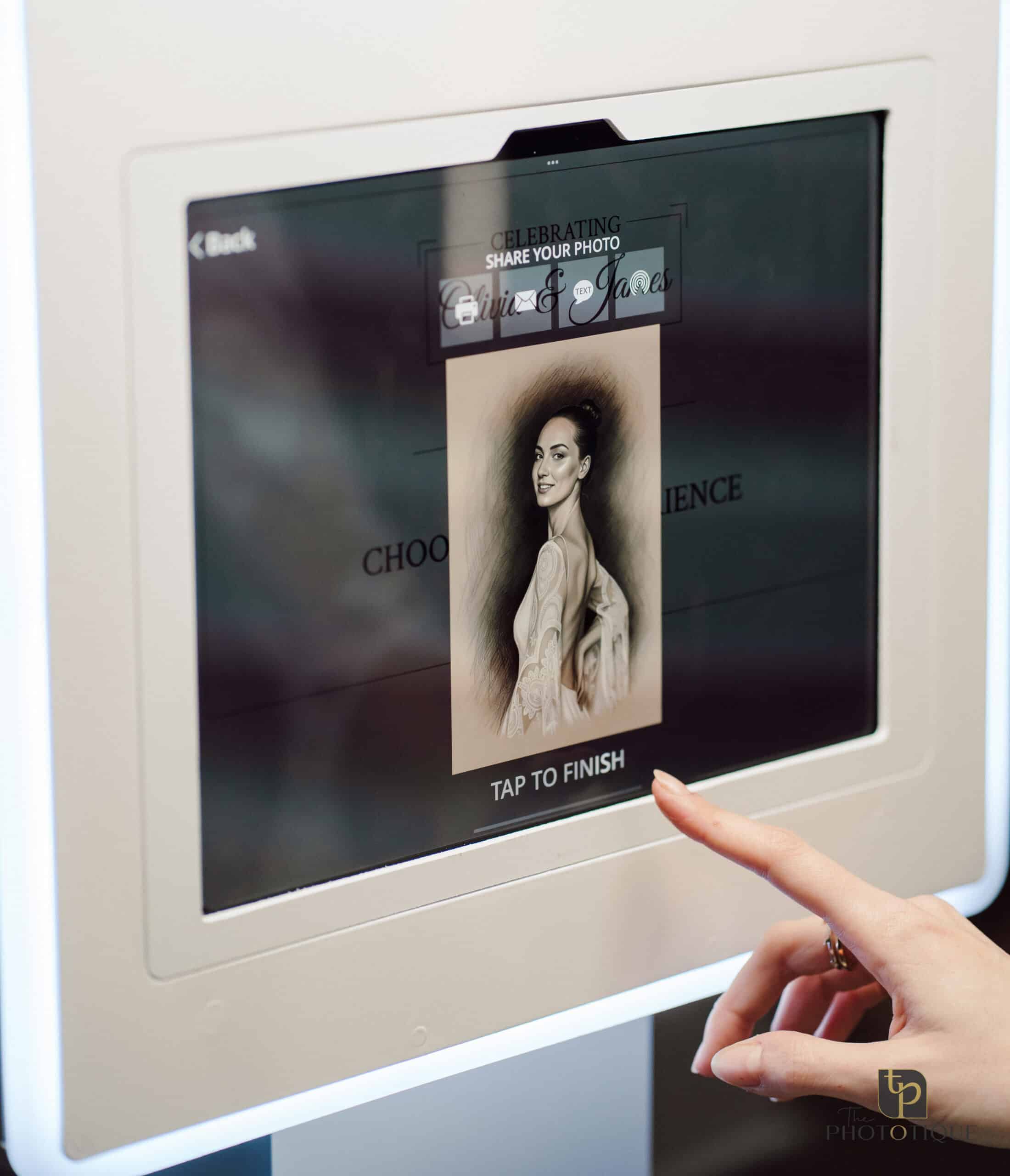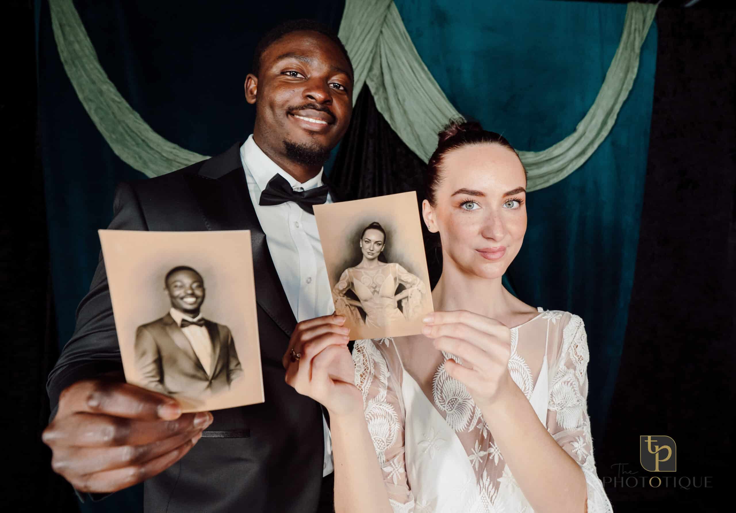 Guests step into a portrait station where their photo is transformed into an illustrated sketch inspired by traditional wedding portrait techniques.
